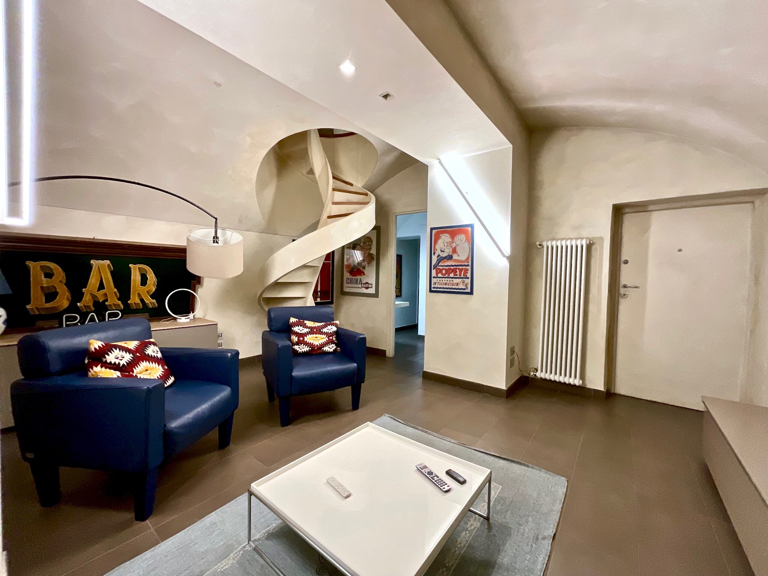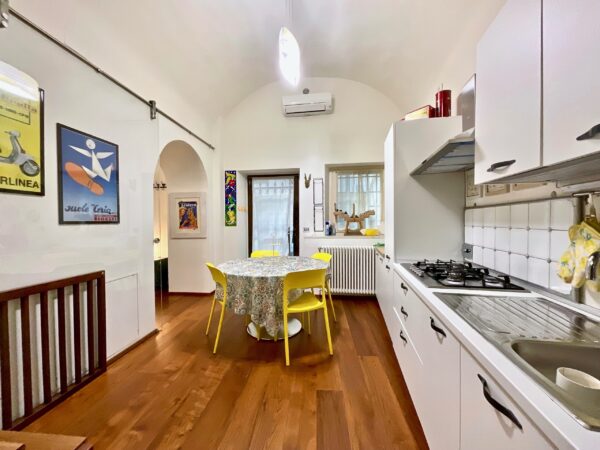 L'appartamento si sviluppa su più livelli, dal piano terra al primo piano fino al piano interrato, ed è comodamente collegato da scala interna, un elemento raro e di grande valore per immobili di questa tipologia. Gli spazi interni sono ampi, armoniosi e caratterizzati da una forte identità estetica, grazie ad elementi di arredo in stile pop art che conferiscono originalità e carattere all'intera proprietà.